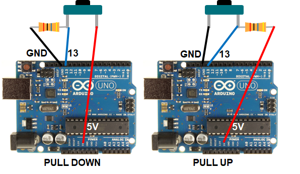 - 5V와 13번핀을 스위치로 연결하였을 때 스위치를 누르면 5V가 13번 핀으로 흐르게 되고 누르지 않는다면 13번 핀은 0V값을 가지게 된다.