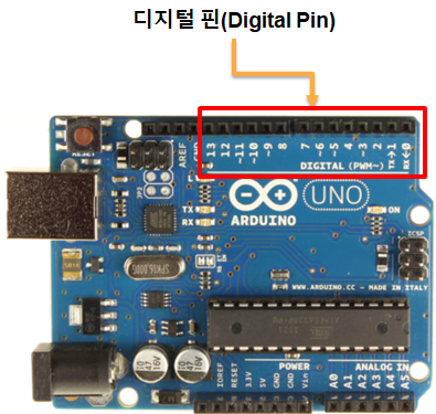 - 아두이노 우노에서는 DIGITAL 0~13까지 적혀있는 핀이 있는데 이 이 부분이 디지털 핀 영역이다.