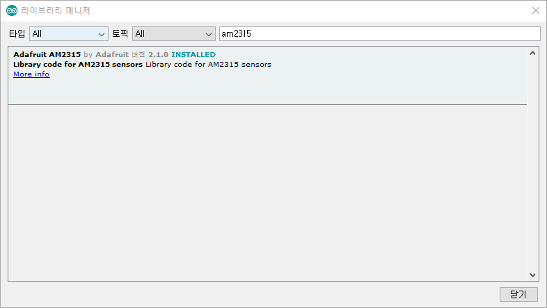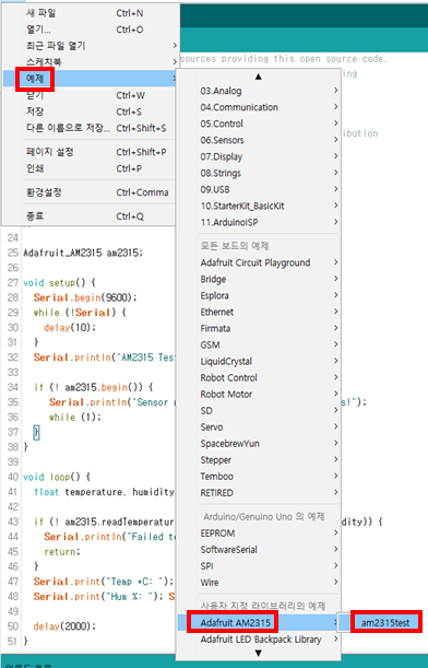 소스는 간단하게 개발하려면 Adafruit AM2315 라이브러리를 받으면 아주 간단하게 AM2315를 사용할 수 있습니다.