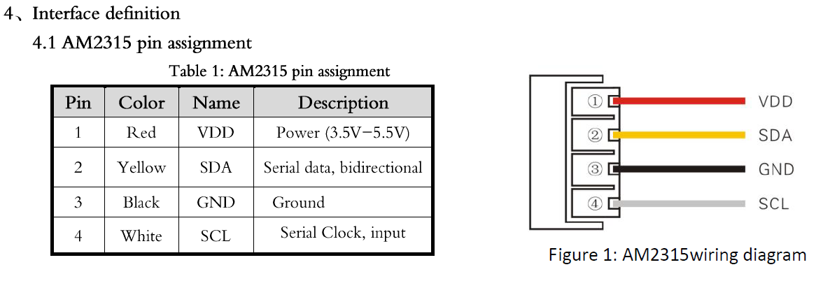 AM2315는 4개의 선이 나오고 각선들은 전원과 통신을 담당하게 됩니다.(요런 인터페이스 사진은 AM2315에 데이터시트를 보면 나옵니다.)